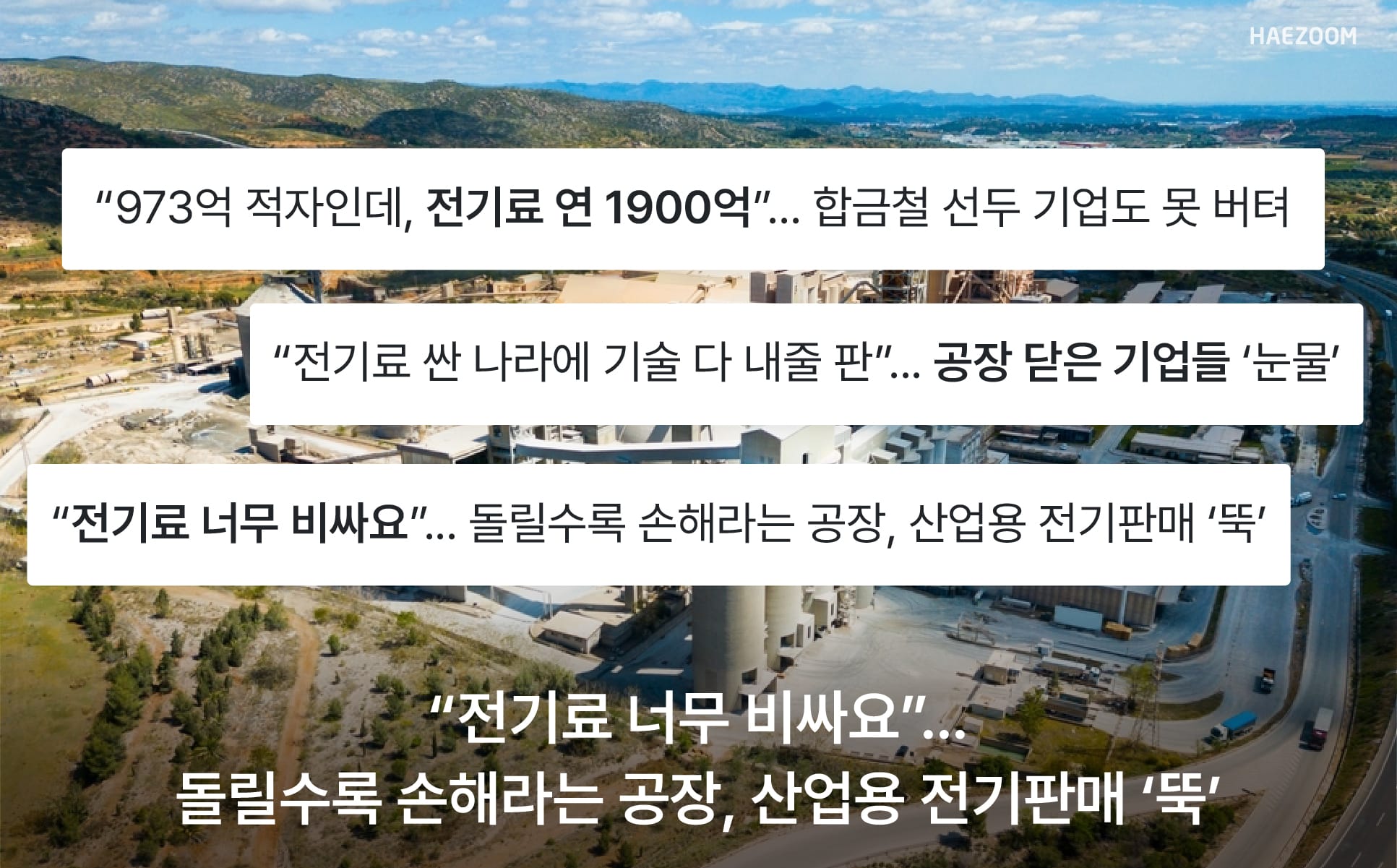 최근 산업용 전기요금이 계속해서 오르면서, 많은 기업들이 에너지 비용 부담을 느끼고 있습니다. 실제로 강원 동해시에 있는 한 시멘트 공장의 전기요금 부담*은 3년 새 2배 가까이 증가했는데요. 이 공장은 적자에 연 1900억 원이라는 전기요금 부담을 이기지 못하고, 공장 가동률을 19.5%까지 감축했습니다.