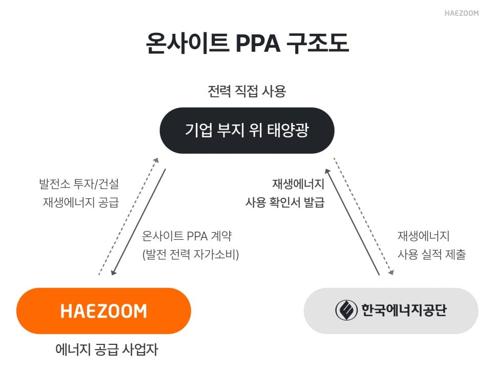 발전소는 재생에너지 공급사업자의 소유로 설치 및 유지 관리에 비용 부담도 없고, 2025년에는 1MW 용량 조건도 폐지되어 온사이트 PPA에 대한 허들이 매우 낮아진 상황입니다.