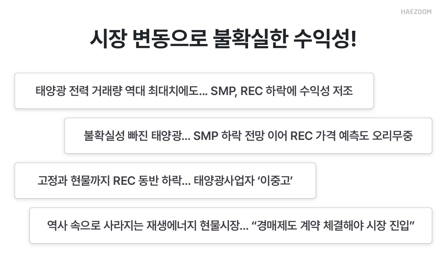 현물시장에서 거래할 경우 SMP/REC 가격 변동으로 인해 수익을 예측하기 어렵고, 기대했던 것 보다 수익이 줄어들 가능성이 큽니다.